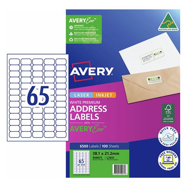 AVERY 959071 L7651 QUICK PEEL ADDRESS LABEL WITH SURE FEED LASER 65UP WHITE PACK 100
