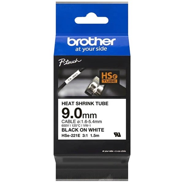 This genuine Brother 9mm HSe-221E heat shrink tube tape is designed specifically for permanently marking and identifying cables and wires - With a shrink ratio of 3:1, the HSe-221E black on white tape is recommended for use with cables between 1.6mm and 5.4mm in diameter