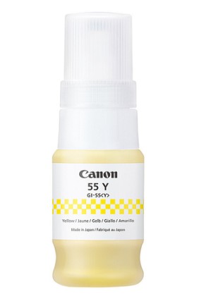 The Canon GI-55Y yellow ink bottle delivers sharp pigment yellow ink to enable the output of business documents and photos at home and at work