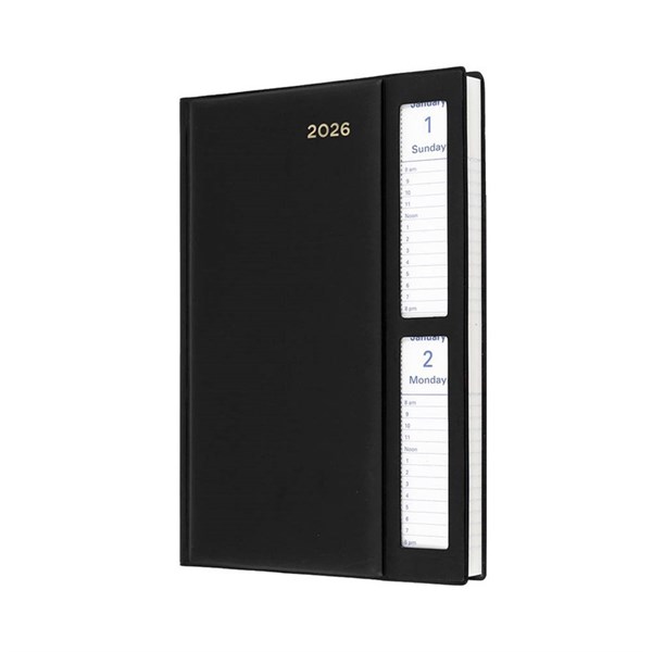 The Belmont desk diary is bound in a highly durable, welded PVC padded cover - A5 size and features a tear-out appointment time section, as well as a clear window to enable the current day to be seen at a glance