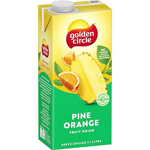 Golden Circle Pine Orange Fruit Drink is a refreshing blend of pineapple and orange flavors, perfect for quenching your thirst anytime - This 1L carton delivers a fruity, naturally delicious taste, ideal for family meals, lunchboxes, or everyday enjoyment