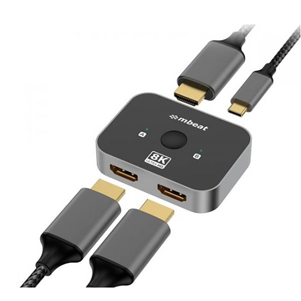 Introducing the mbeat 8K Bi-directional HDMI 2.1 Switch, a compact, plug-and-play solution for seamless switching between two HDMI sources and one display, or one source and two displays - Supporting up to 8Kat60Hz and 4Kat144Hz, it delivers ultra-high-definition visuals with HDMI 2.1 compatibility