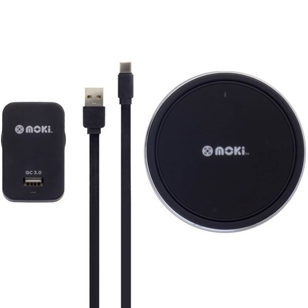 Moki Wireless Charging Pads are designed to be used just about anywhere in the home, in the living room, the bedroom, or kitchen. A simple, no fuss way to charge a smartphone - great for home or in the office - Includes: Qualcomm QuickCharge 3.0 Wall Charger, 1.5m USB-A to Type-C Cable