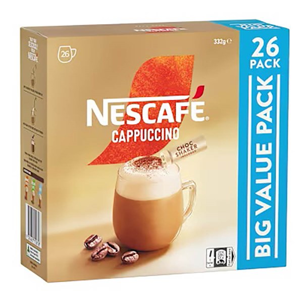 Enjoy the creamy, frothy taste of cappuccino anytime with NescafE Cappuccino Sachets - Each pack contains 26 convenient single-serve sachets, making it easy to prepare a delicious cappuccino at home, in the office, or on the go