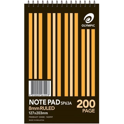 OLYMPIC SP63A NOTEPAD SPIRAL BOUND 8MM RULED 200 PAGE 127 X 203MM WHITE PACK 10