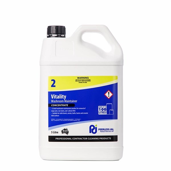 Peerless Jal Vitality is an organic formula acidic washroom cleaner that removes soap scum from baths, showers, hand basins and tile surfaces, and calcium, verdigris and rust stains from toilet bowls and urinals - Vitality also cleans and deodorizes washroom floors and grouting