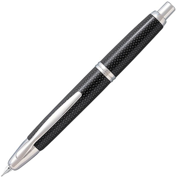 The Pilot Capless Splash fountain pen balances luxury with an industrial edge - The pen has a carbonesque barrel colour, in black, blue, red and white with rhodium accents and a matching rhodium plating 18k gold nib