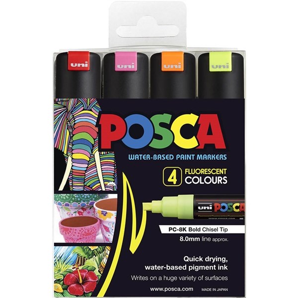 POSCA PC-8K PAINT MARKER CHISEL BROAD 8MM ASSORTED FLUORO PACK 4