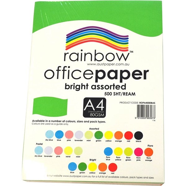 Rainbow Office Paper is a top range stationery paper perfect for Office use in laser and ink jet printers - It is also a versatile craft paper perfect for kids Art and Craft projects