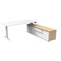 - The integrated side cabinet provides convenient storage with drawers and cupboards, enhancing workspace organisation and efficiency