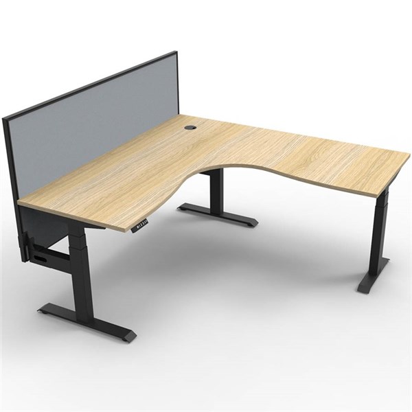 RAPIDLINE BOOST PLUS HEIGHT ADJUSTABLE CORNER WORKSTATION WITH SCREEN 1500 X 1500 X 750MM NATURAL OAK TOP / BLACK FRAME / GREY SCREEN