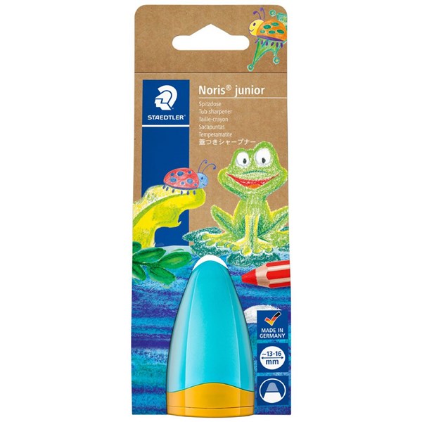 The Staedtler Noris Junior Tub Sharpener features a flat sharpening angle for thick, soft coloured strokes, so you can keep your favourite pencils ready for use - With dual sharpening, you can either turn the coloured pencil or the sharpener, making it suitable for left-handed users