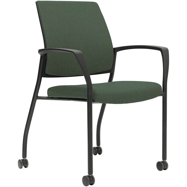 Urbin multi-purpose stackable armchair with upholstered inner and outer back and upholstered padded seat - Fully welded black powdercoat 4 leg steel frame on castors